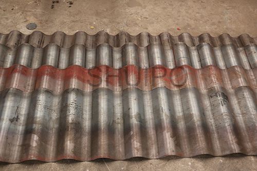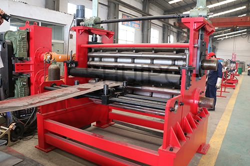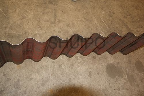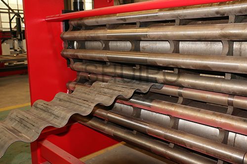 波紋板成型機主要分為機架、驅動部分、上壓輪、下壓輪、進料導向機構、以及前后工作臺,波紋板成型機是通過同時旋轉的上、下壓輪,將平板加工成波紋狀,成型效果一致性好,效率高,波紋的高度調整有電機驅動,通過操作控制箱上的按鈕調整波紋高度范圍,調整方便,性能可靠。